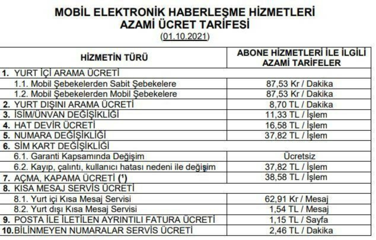 Aynı düzenleme kapsamında isim/ünvan değişikliği 11 lira 33 kuruş, numara değişikliği 37 lira 82 kuruş, hat devir ücreti 16 lira 58 kuruş, açma kapama ücreti 38 lira 58 kuruş, yurt içi kısa mesaj servisi 62,91 kuruş, yurt dışı kısa mesaj servisi ise 1 lira 54 kuruş oldu.